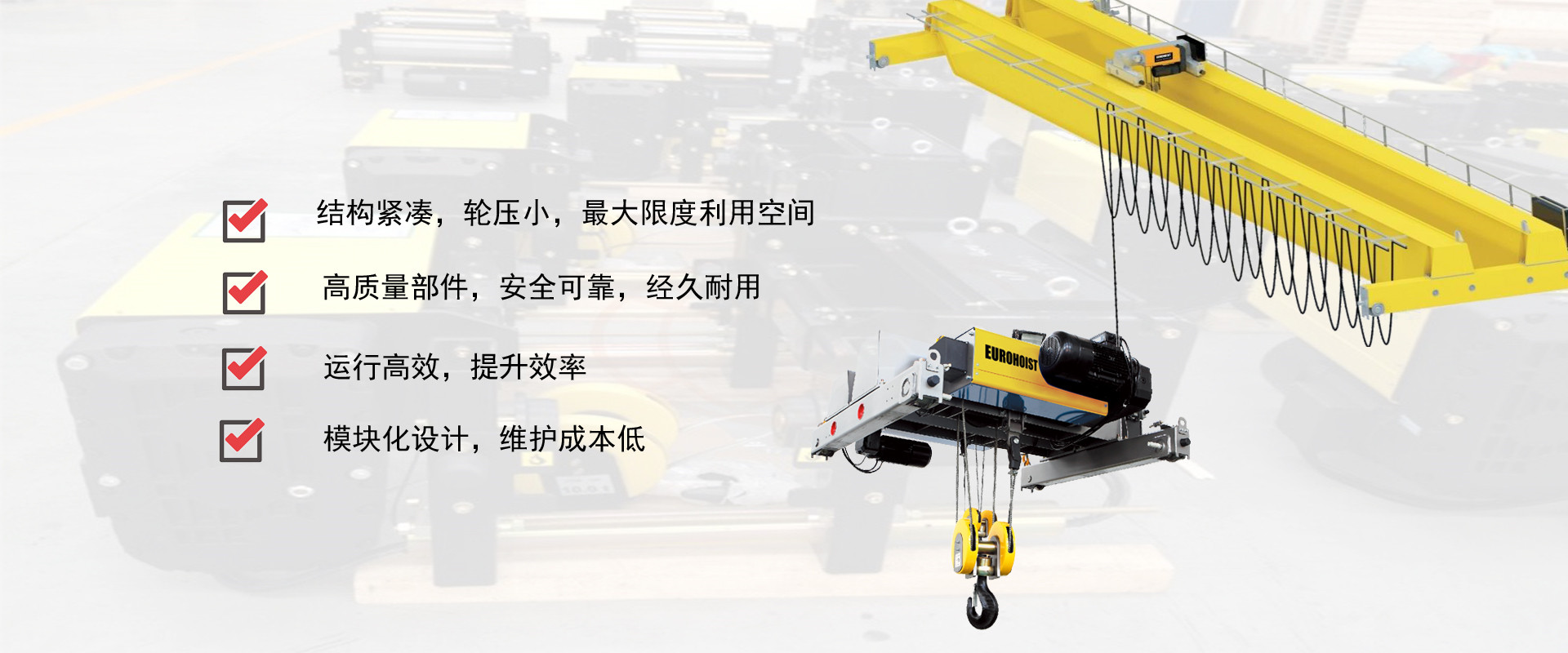 密歇爾起重機(jī)械(杭州)有限公司提供全面的起重輸送產(chǎn)品和服務(wù),產(chǎn)品覆蓋環(huán)鏈電動(dòng)葫蘆(125Kg-80T),歐式鋼絲繩葫蘆,防爆葫蘆,懸臂吊,KBK柔性起重機(jī),歐式起重機(jī),起重馬達(dá),端梁,起重移動(dòng)供電系統(tǒng)等,在國(guó)內(nèi)外被廣泛的應(yīng)用于生產(chǎn)車間,汽車,模具,機(jī)械制造,鐵路,船舶,物流搬運(yùn),現(xiàn)代化工廠流水線等工業(yè)及其它特殊用途。